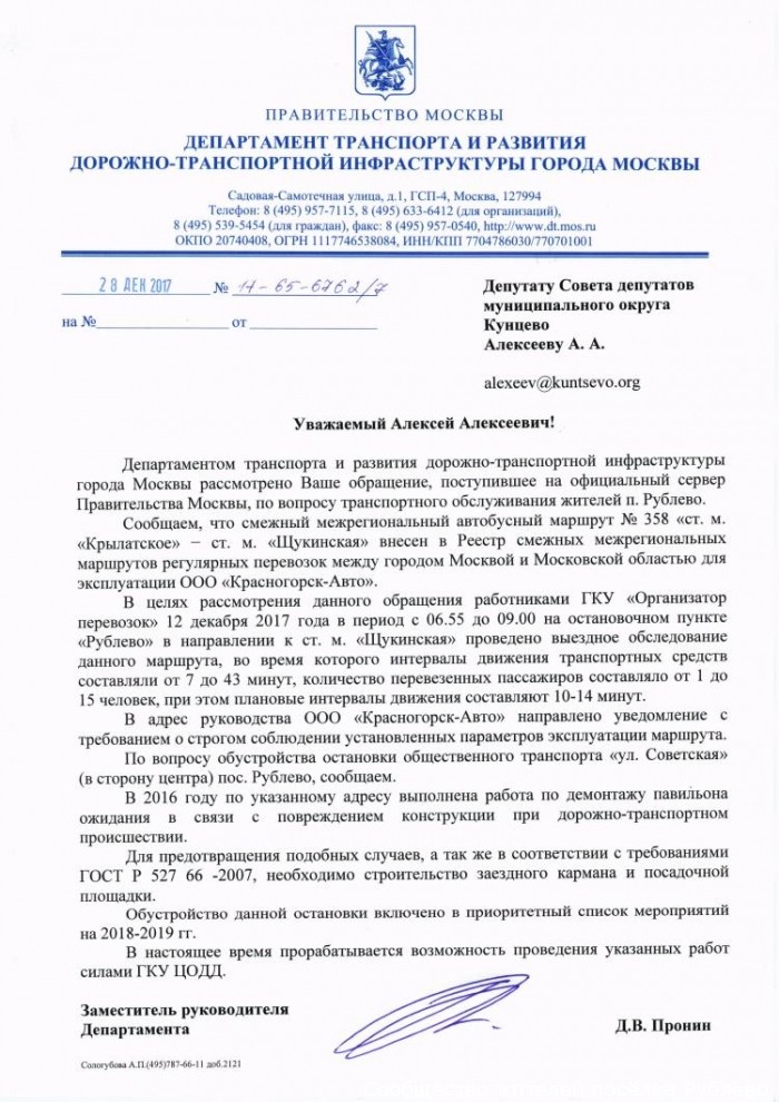 12 декабря 2017 года в период с 06.55 до 09.00 провели проверку. Интервал составил от 7 до 43 минут (При пассажирах от 1 до 15 человек), при плановом интервале 10-14 минут. В адрес руководства ООО «Красногорск-Авто» направлено уведомление с требованием о строгом соблюдении установленных параметров эксплуатации маршрута.